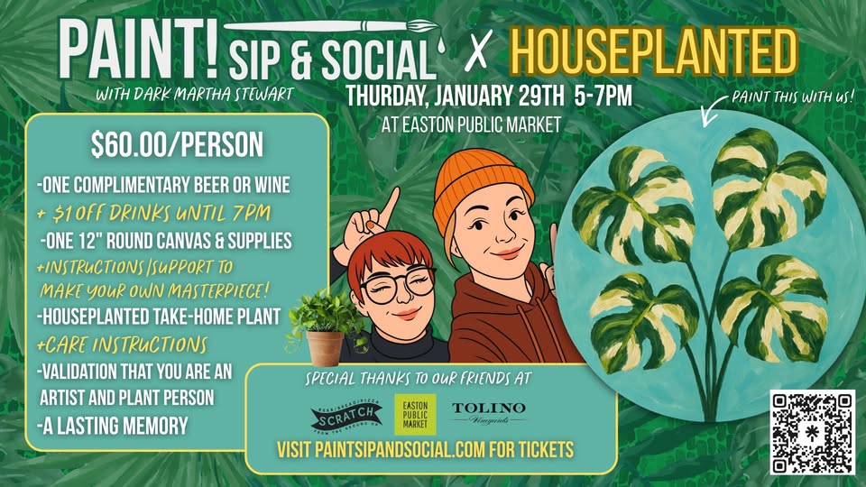 Join us for an extra special plant-y paint night collab with HousePlanted! Thursday, January 29th at Easton Public Market, Aerin will be on the mic teaching how to paint “I Wet My Plants”, a 12” round monstera painting.